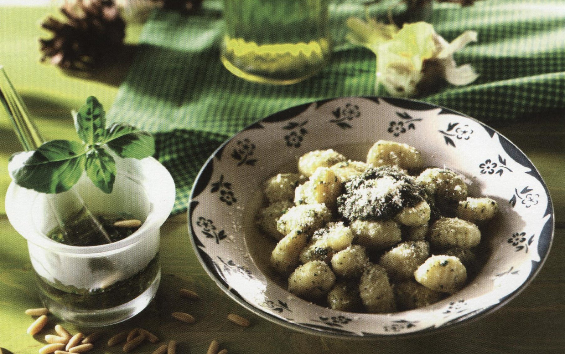 Preparare gli gnocchi impastando 1 kg di patate, 0,3 kg di farina, 1 uovo, sale. Lessarli e condirli con un battuto di: basilico, aglio, pinoli, parmigiano, sale.