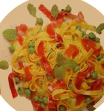Ingredienti per 4 : 300 gr di tagliatelle all'uovo secche 8 fette di prosciutto crudo dolce 100 gr di piselli surgelati 50 gr di cipollotto fresco un ciuffo di prezzemolo alcune foglie di basilico o menta mezza tazza di brodo vegetale 40 gr di burro 2 cucchiai di olio extravergine di oliva sale, pepe.Preparazione: