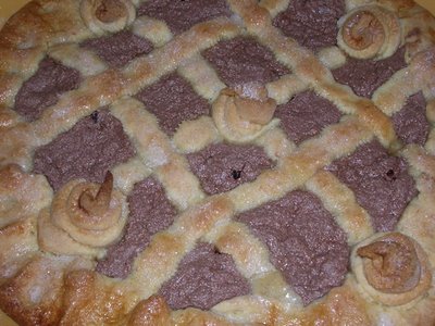 1 confezione di pastafrolla Ripieno: 500 g ricotta 2 uova 300g di cioccolato fondente 1 bustina vanillina 10g zucchero a veloPreparazione: