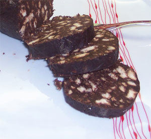 Lavorare due tuorli con due cucchiai colmi di zucchero sino a quando non avrete ottenuto una crema morbida. Aggiungere il burro sciolto, lo zucchero mescolato al cacao amaro ed il rhum. Mescolare tutto molto bene e quando i vari ingredienti si saranno ben amalgamati unire i biscotti secchi tagliati a pezzettini di un centimetro e mezzo circa di lato. Mescolare in modo che il cioccolato leghi bene i biscotti poi verrsare il tutto in una carta oleata chiudendola con cura dopo averla arrotolata. (Il dolce deve avere la forma di un salame). Mettere in frigorifero per qualche ora togliendolo solo quando sarà diventato ben duro. Togliere la carta oleata e servirlo a fette.