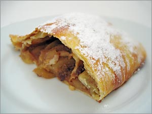 Tempo di preparazione 20 minuti. Tempo di cottura 30 minuti. Stendete la pasta sfoglia senza togliere la carta e disponetela sulla placca del forno, ottenendo due rettangoli di circa 25 x 40 cm. Sbucciate le mele, eliminate il torsolo e tagliatele a fette sottili in una terrina. Aggiungete l'uva sultanina, i pinoli, lo zucchero, la cannella, la scorza di limone grattuggiata e il pangrattato, precedentemente tostato in poco burro. Mescolate bene il tutto e versate poi su ciascun rettangolo di pasta meta' del ripieno, spennellate i bordi con del rosso d'uovo e arrotolate con cura sul lato lungo. Successivamente spennellate con rosso d'uovo anche la superficie degli strudel. Infornare per 30 minuti nel forno gia' caldo a 180 gradi. Servite sia caldo che freddo, anche con della panna montata.