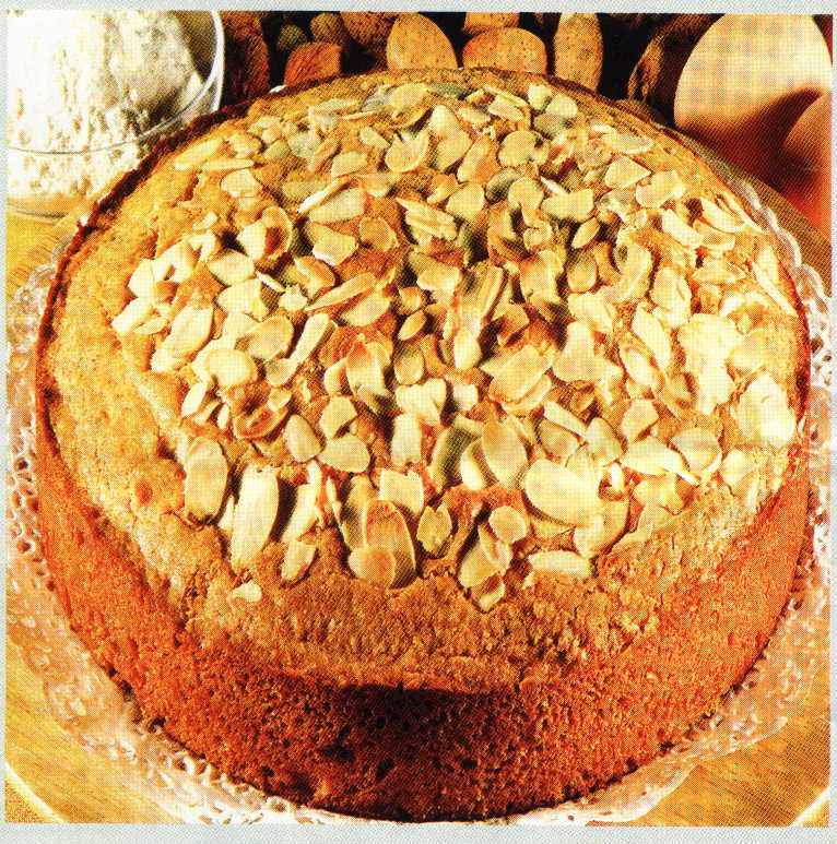 Sbattere le uova con lo zucchero e il burro sciolto a bagnomaria. Aggiungere la farina, il lievito e le mandorle macinate. Mettere il composto in uno stampo imburrato e passarlo al forno, a calore spinto, per mezz'ora. Attenzione: non aprire il forno durante la cottura !