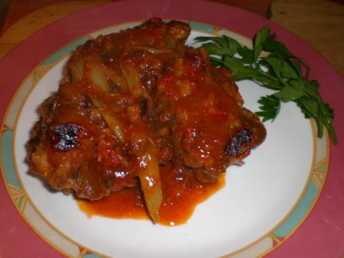 (per 4 persone): 1 kg di coda di bue 50 gr di lardo prezzemolo 1 spicchio d'aglio 1 carota 1 gambo di sedano olio e burro 1 cipolla media 1 bicchiere di vino rosso pomodori sale e pepe.Preparazione: