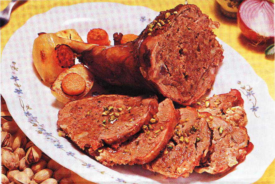 Ingredienti per 4 persone Un cosciotto di Agnello da 600 g Polpa di Maiale tritata: 100g Salsiccia: 50g Pane raffermo: 40g Latte: 50g Vino bianco: 50g Pistacchi sgusciati: 30g Una costa di sedano 2 carote Una cipolla piccola Olio extravergine d'oliva Sale e pepePreparazione: